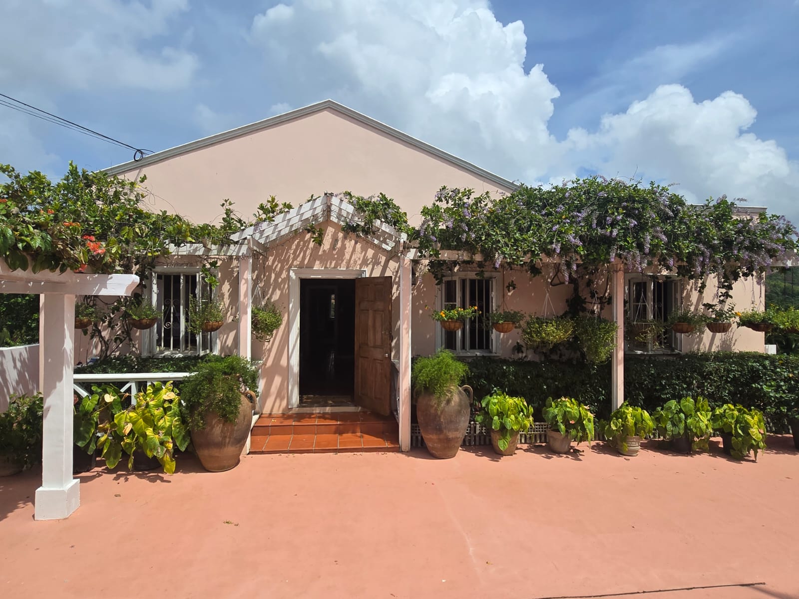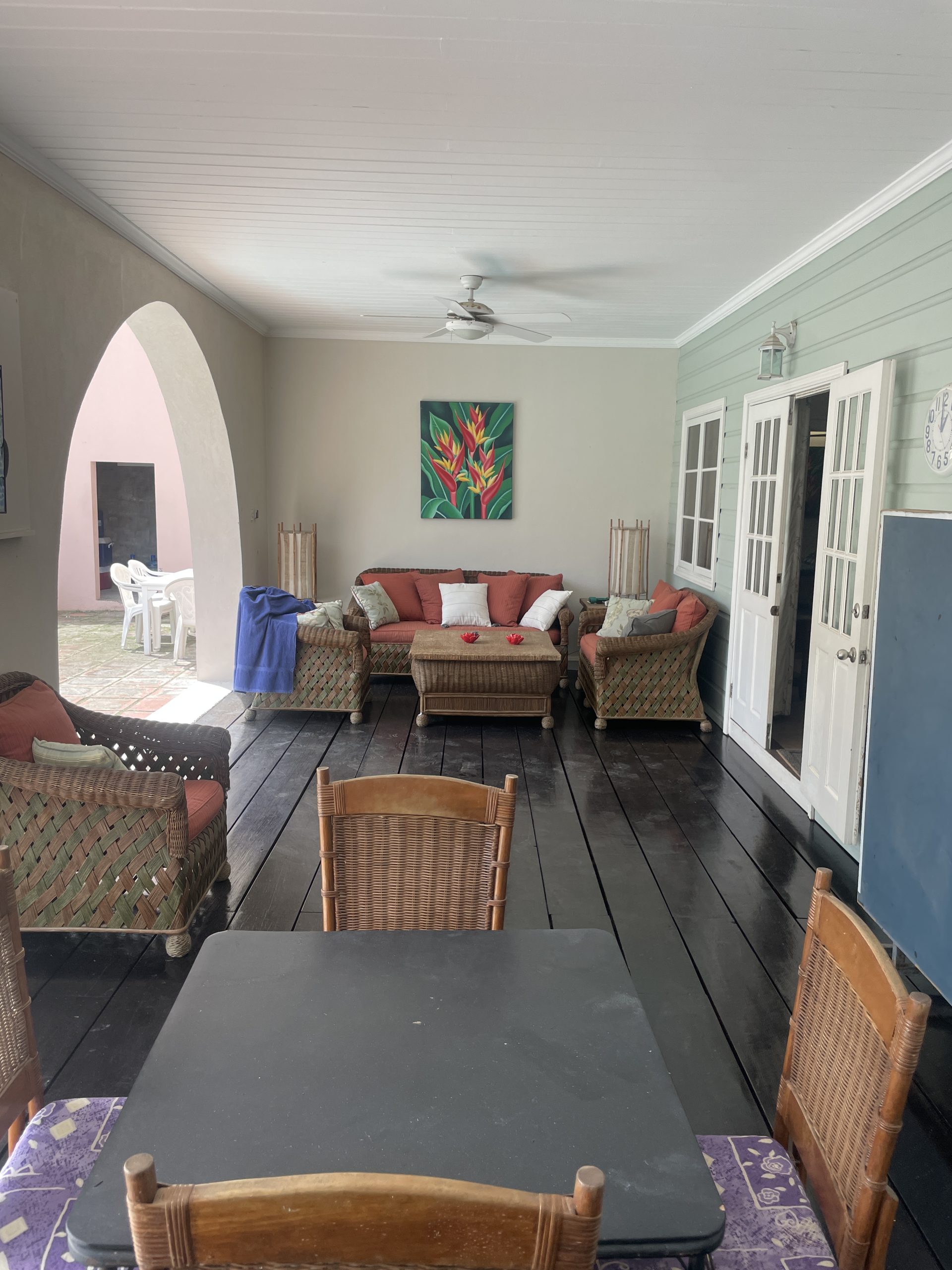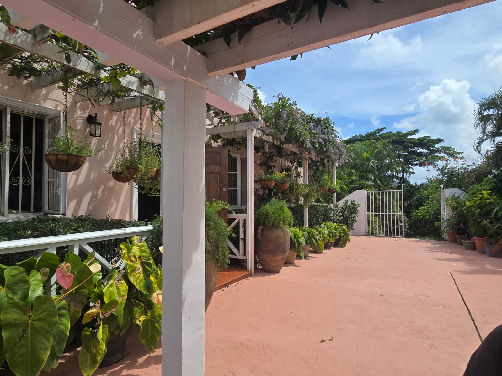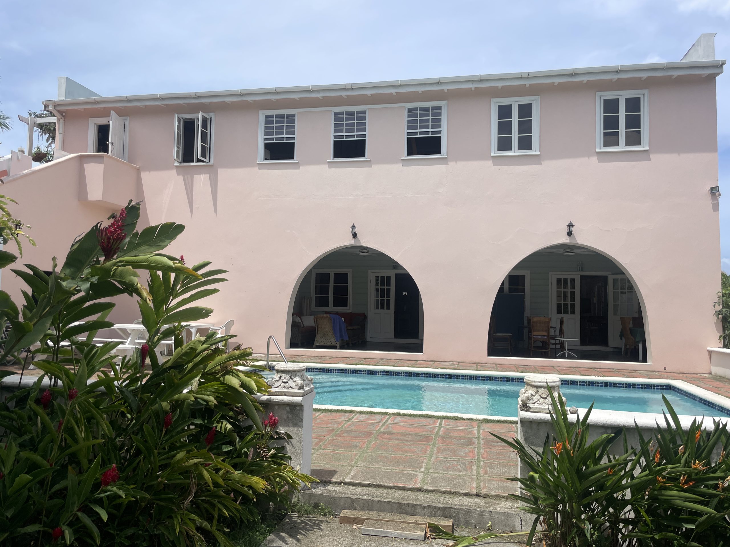 Outdoors, the property embraces Saint Lucia’s natural beauty with lush tropical landscaping and a welcoming private pool area. A covered patio with charming arched openings provides an ideal setting for alfresco dining, relaxation, or entertaining—complete with space for games such as table tennis. The entrance is equally inviting, featuring a pergola draped in vibrant bougainvillea that sets the tone for the tranquil living experience inside.