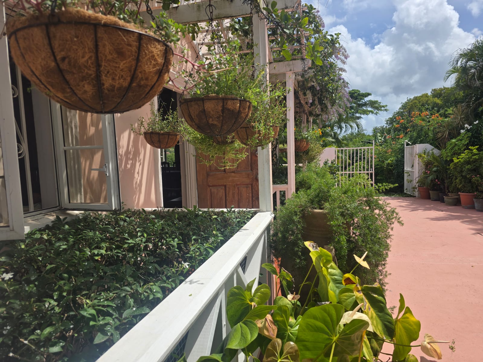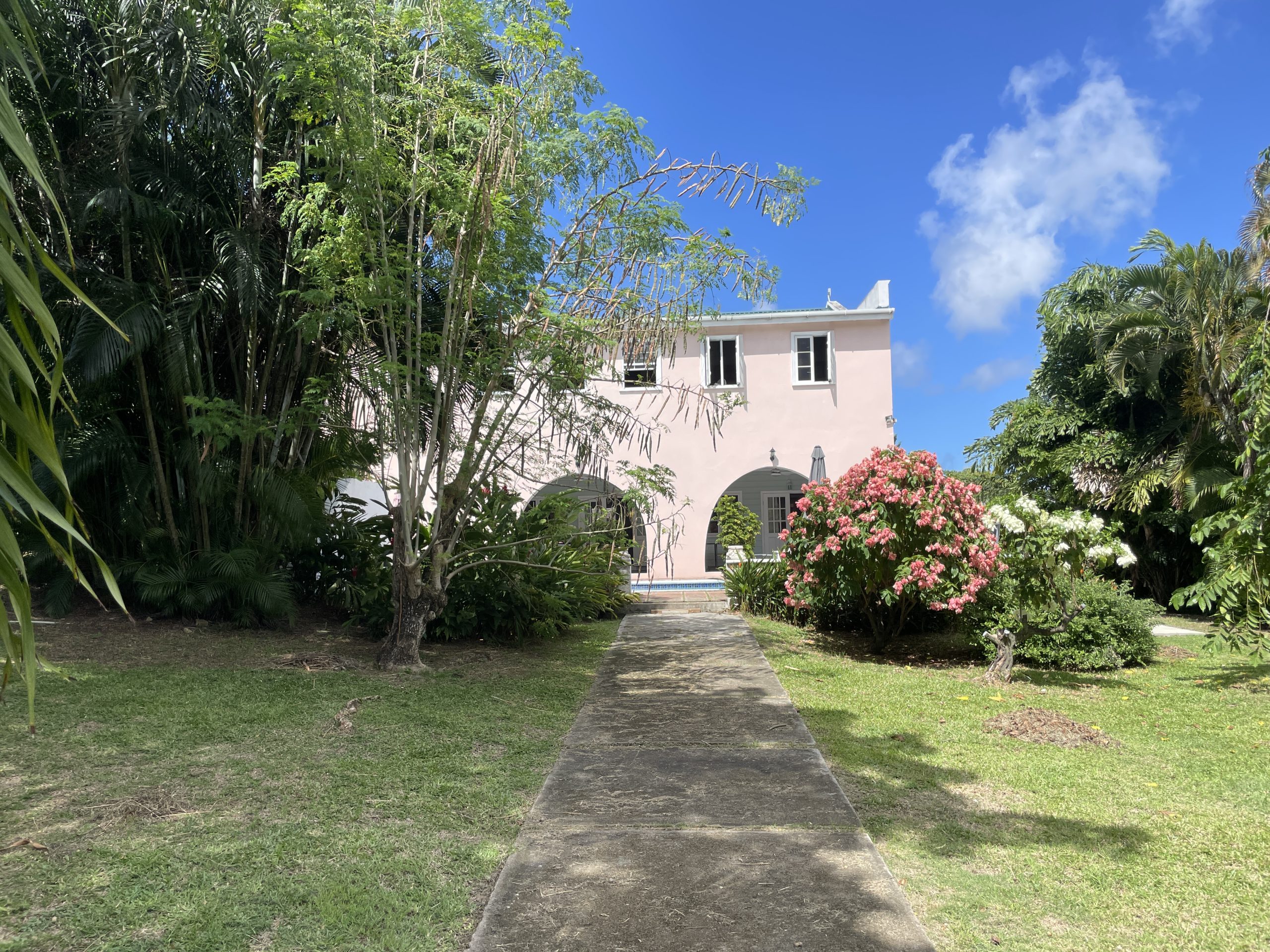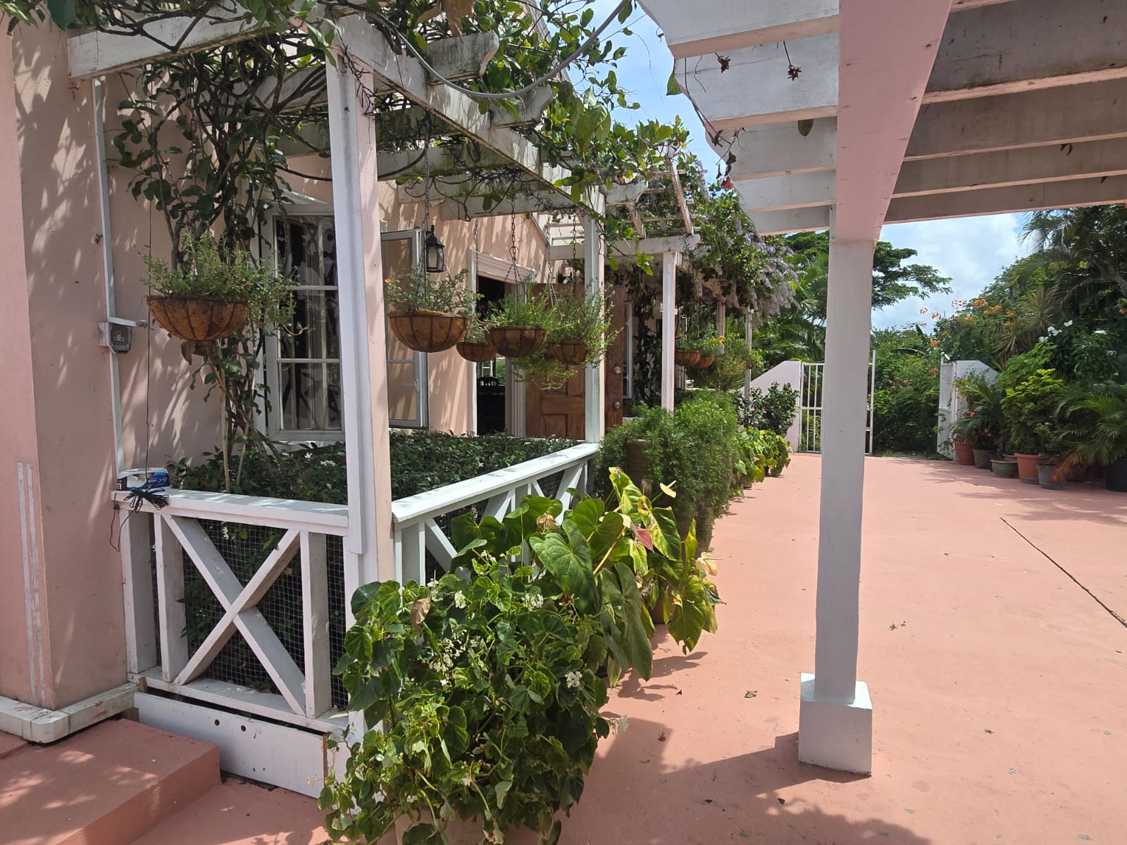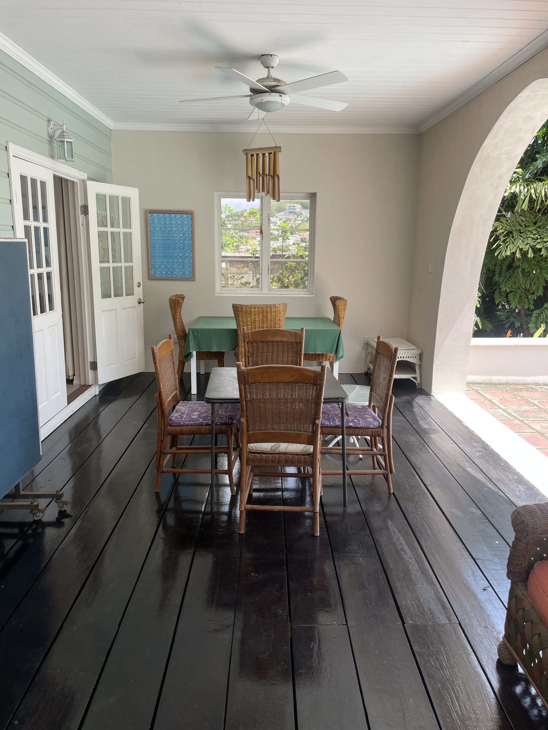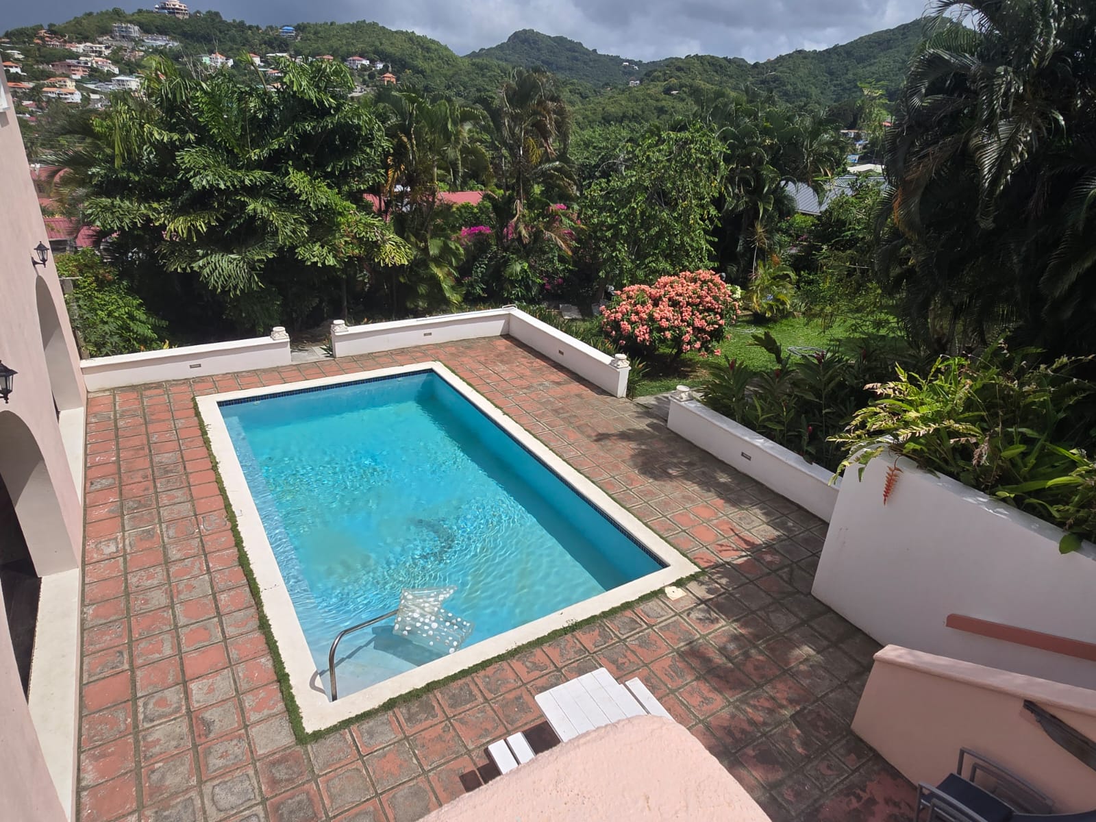 Outdoors, the property embraces Saint Lucia’s natural beauty with lush tropical landscaping and a welcoming private pool area. A covered patio with charming arched openings provides an ideal setting for alfresco dining, relaxation, or entertaining—complete with space for games such as table tennis. The entrance is equally inviting, featuring a pergola draped in vibrant bougainvillea that sets the tone for the tranquil living experience inside.
