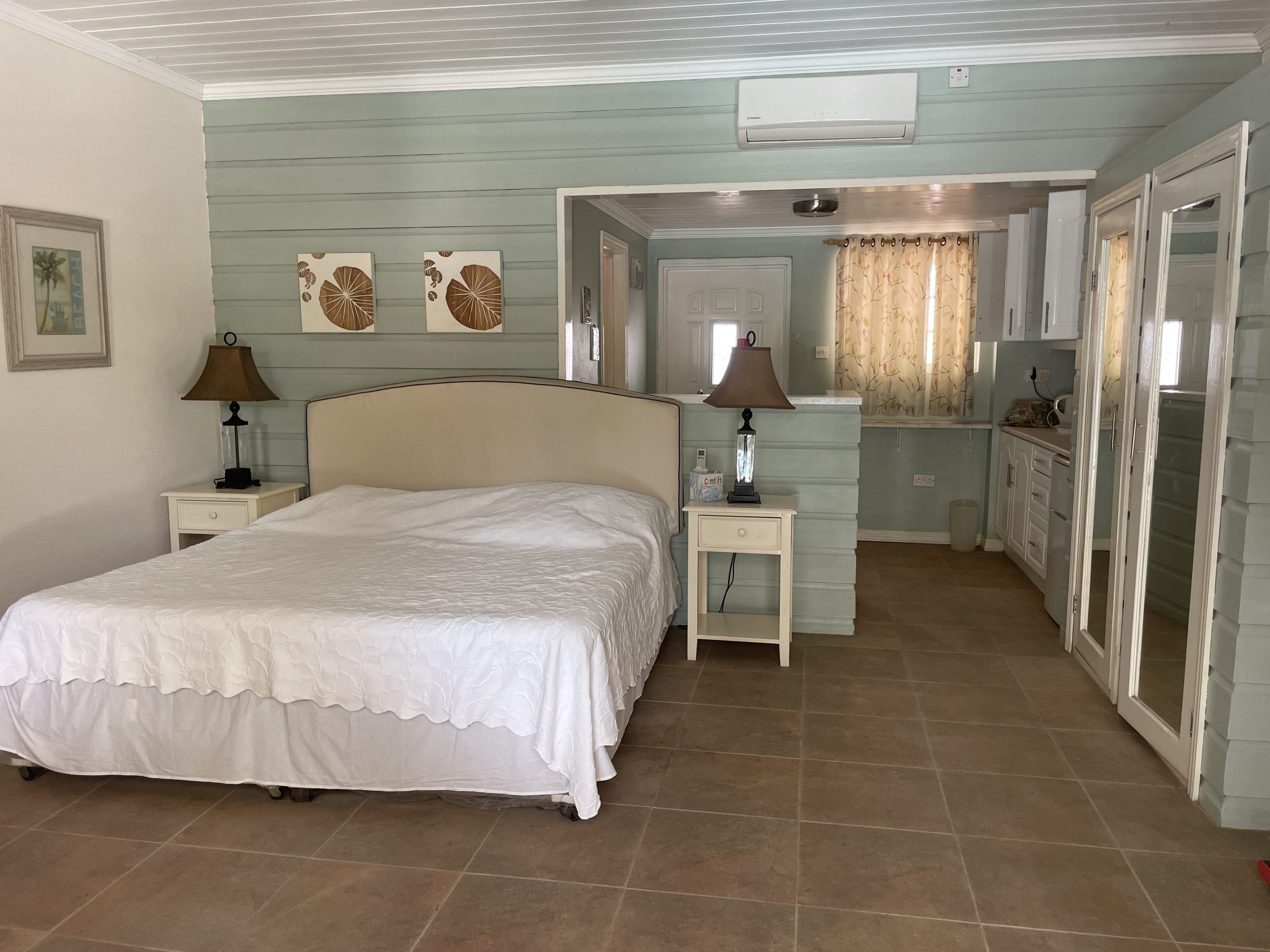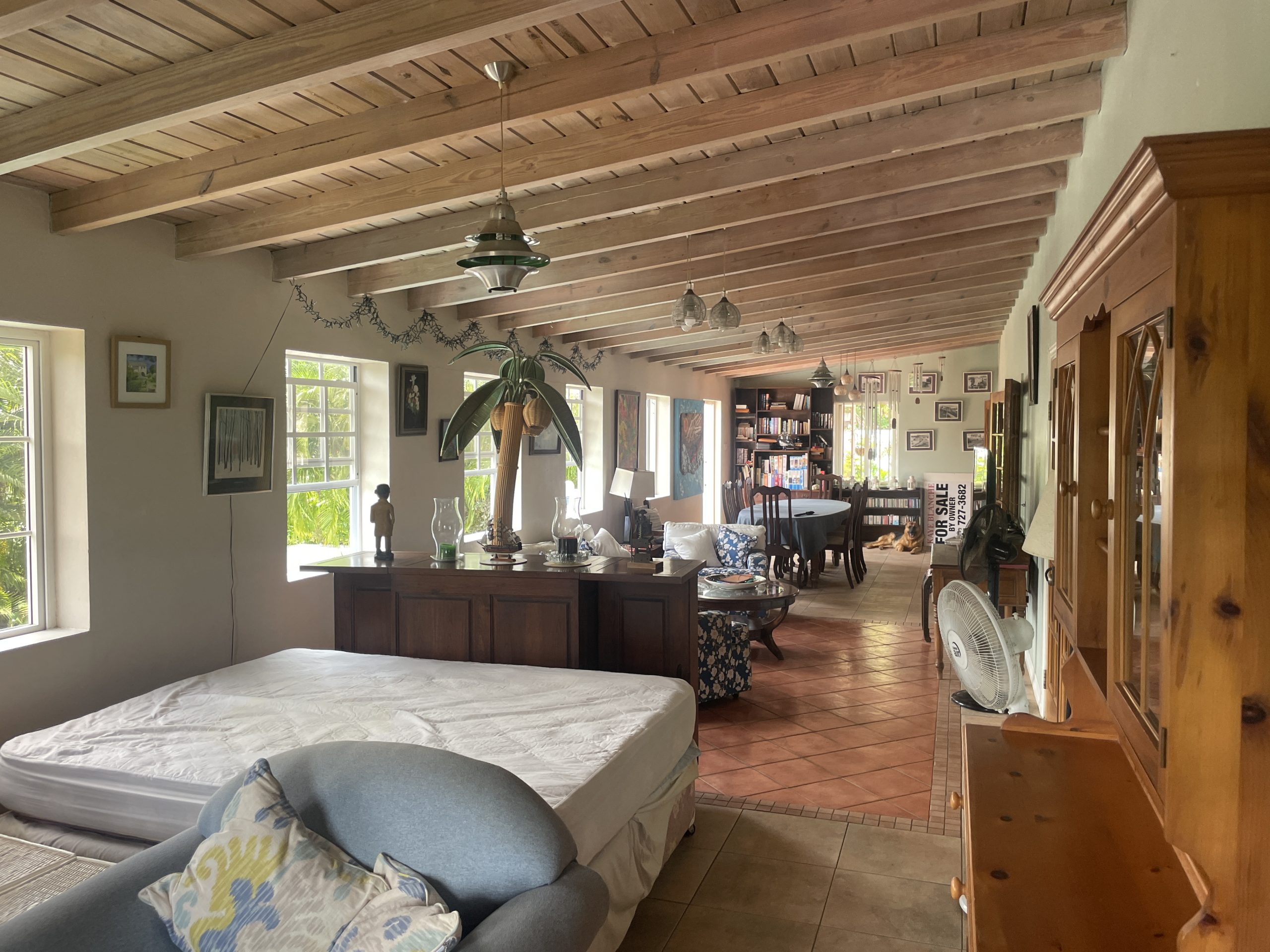 Inside, the villa exudes a calm coastal ambience with its palette of whites and soft blues, natural wood accents, and tiled floors throughout. Vaulted ceilings with exposed beams add architectural interest and enhance the feeling of light and openness. Each space flows comfortably into the next, supported by thoughtful amenities such as a dedicated laundry room, utility room, walk-in closet, maid’s quarters, air conditioning, and secure fencing. Offered fully furnished, the home is move-in ready and well suited for Airbnb or long-term rental potential.