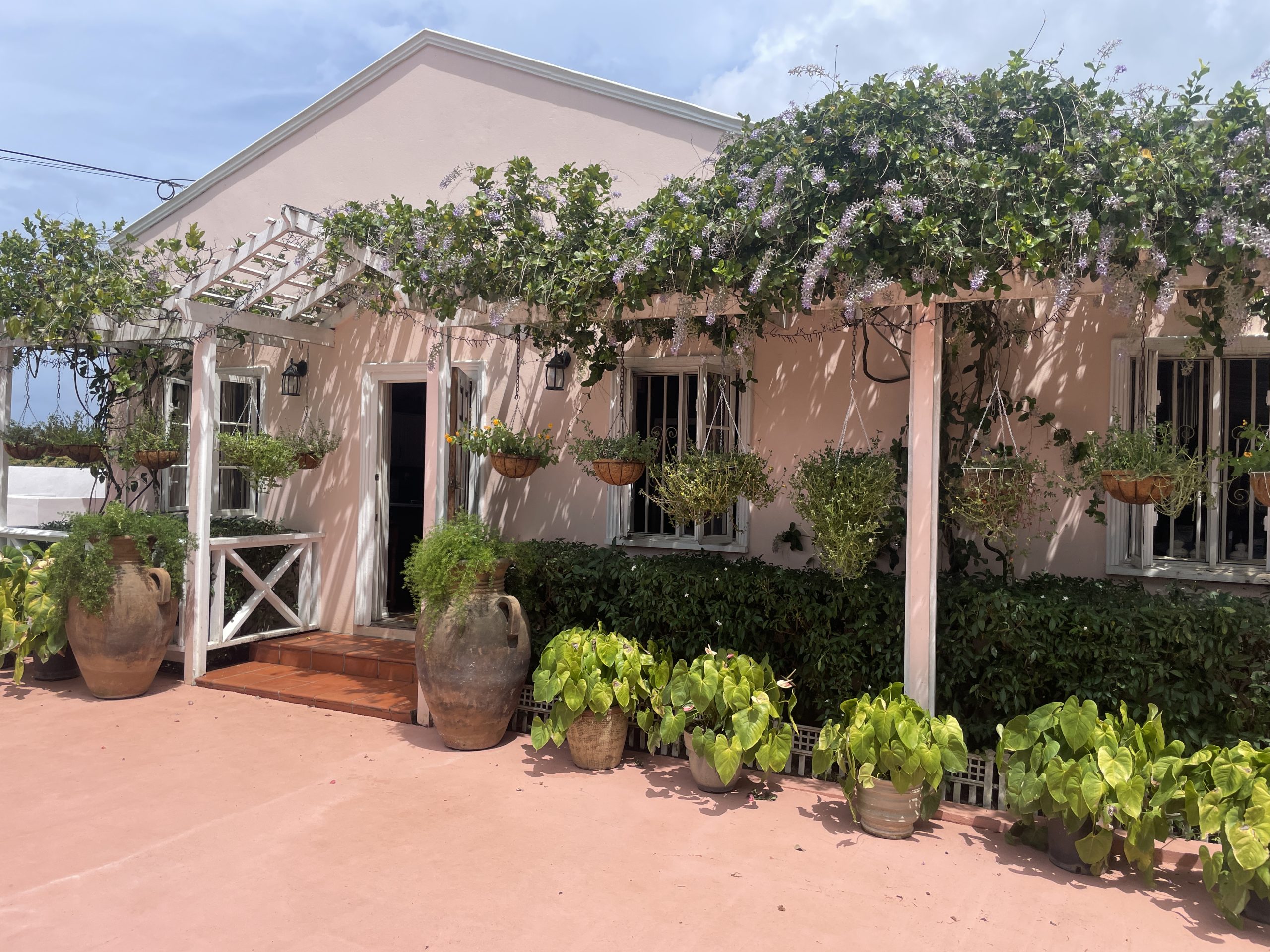 Outdoors, the property embraces Saint Lucia’s natural beauty with lush tropical landscaping and a welcoming private pool area. A covered patio with charming arched openings provides an ideal setting for alfresco dining, relaxation, or entertaining—complete with space for games such as table tennis. The entrance is equally inviting, featuring a pergola draped in vibrant bougainvillea that sets the tone for the tranquil living experience inside.